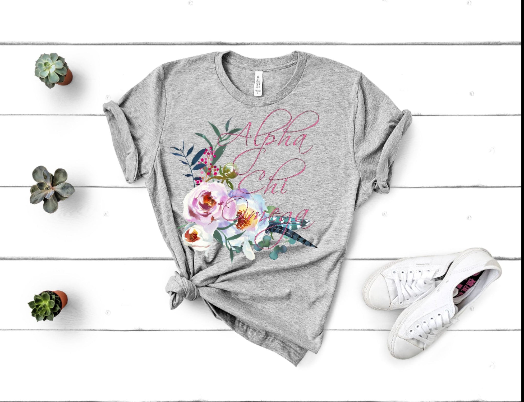 Show your love for Alpha Chi Omega with this Bella Canvas t-shirt. The shirt is available in many different colors. The design is a floral pattern on the lower corner with Alpha Chi Omega on the right side