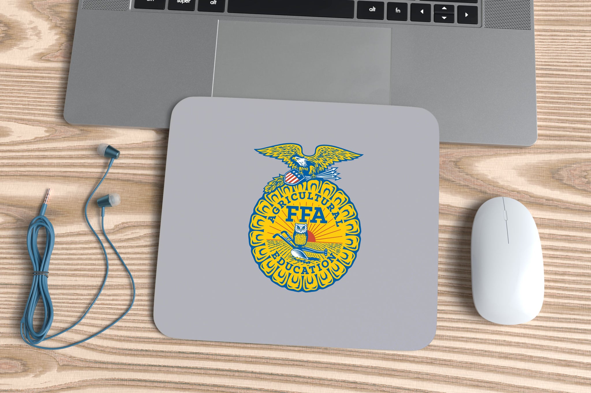 Show your FFA pride every day with this vibrant sublimated mouse pad! Featuring the official FFA emblem  printed in full color, this durable mouse pad adds a touch of agricultural spirit to your workspace. The smooth polyester surface provides precise mouse control and brilliant color detail, while the non-slip rubber backing keeps it firmly in place during use.
